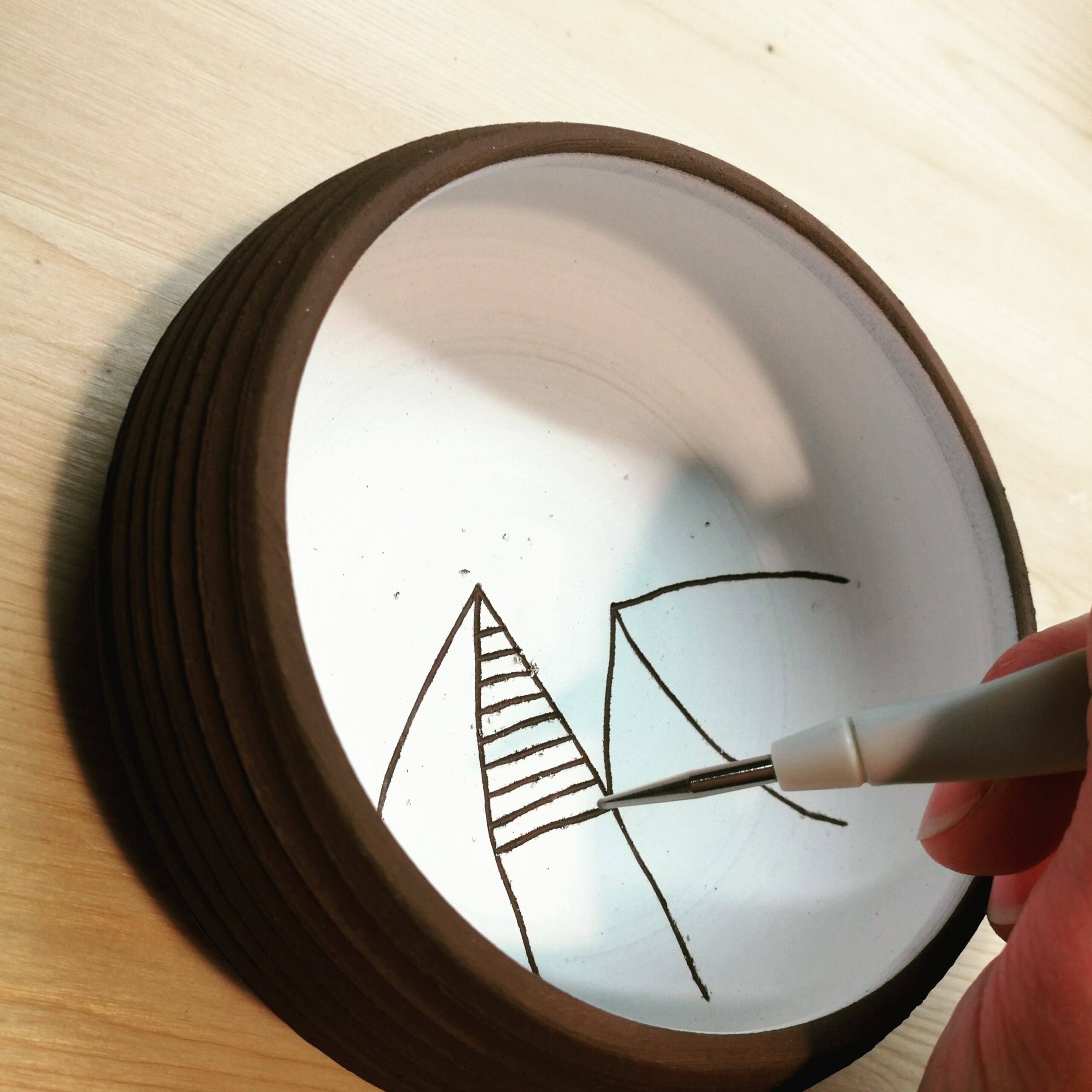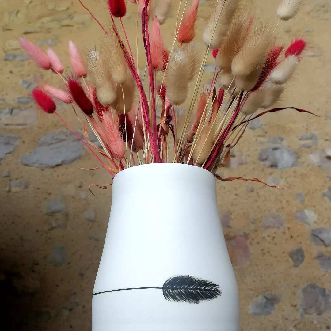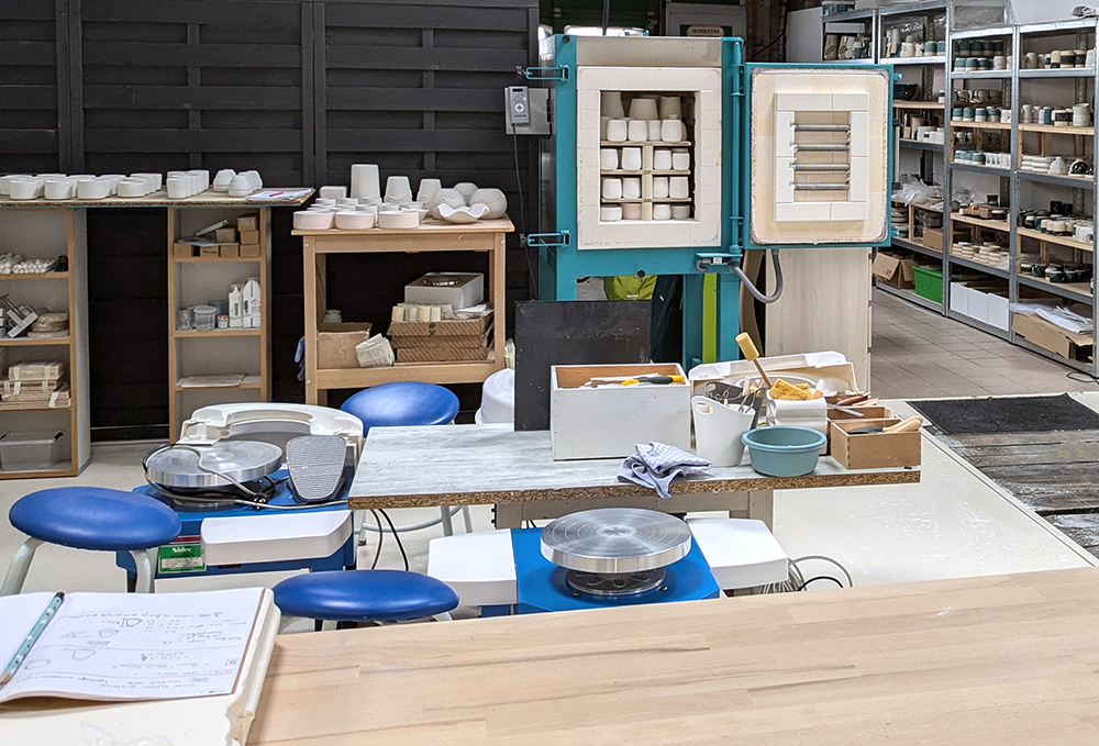 Pour les cours que je propose, l’atelier dispose de 3 tours, d’un espace dédié au travail du modelage et à la plaque ainsi qu’un espace dédié au décor et d’un four à cuisson haute température.
