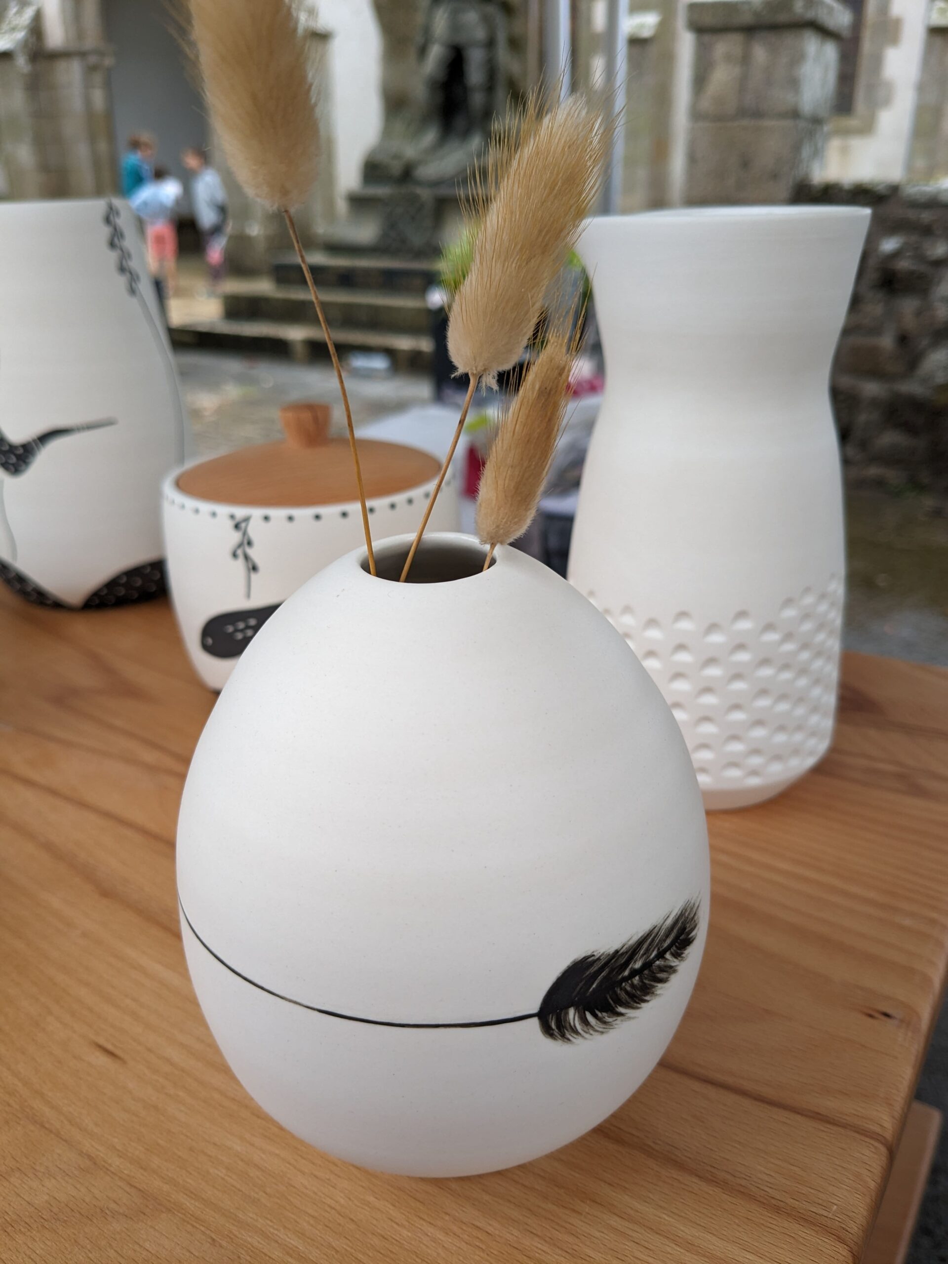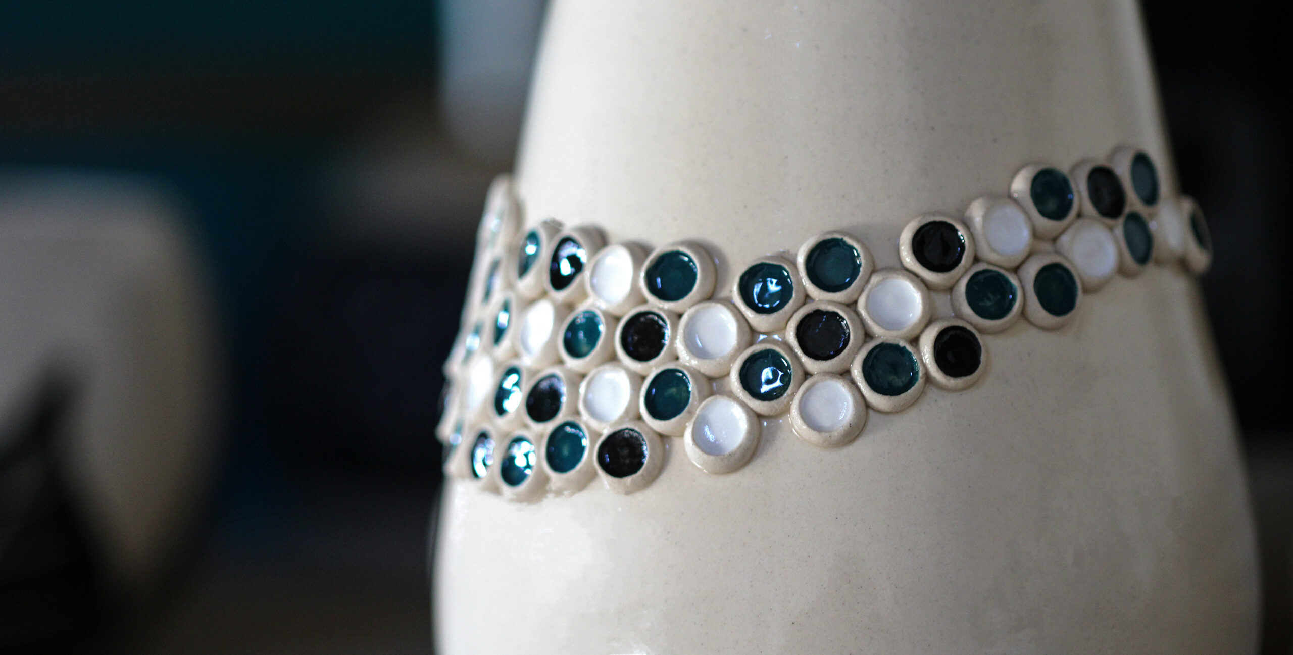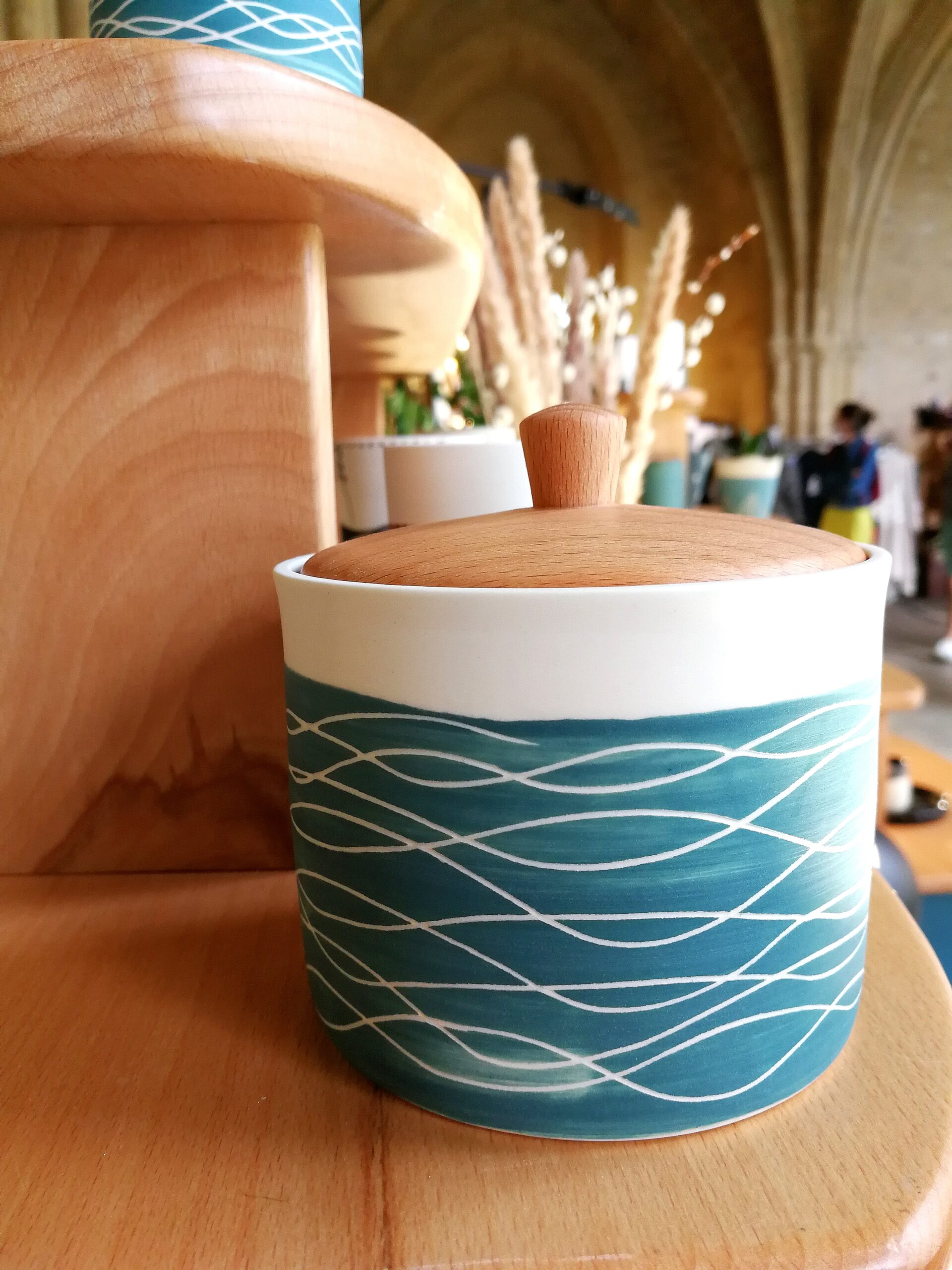 Pour les cours que je propose, l’atelier dispose de 3 tours, d’un espace dédié au travail du modelage et à la plaque ainsi qu’un espace dédié au décor et d’un four à cuisson haute température.